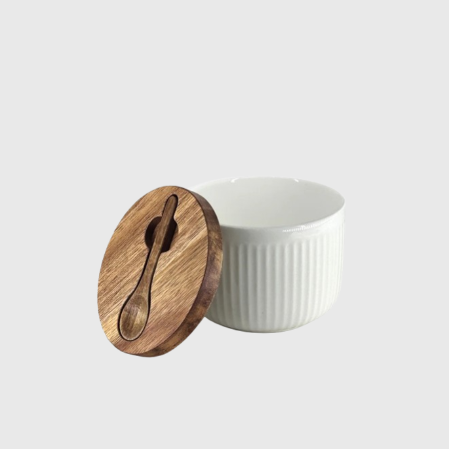 - Main de sel, en porcelaine avec couvercle en bois d'acacia.