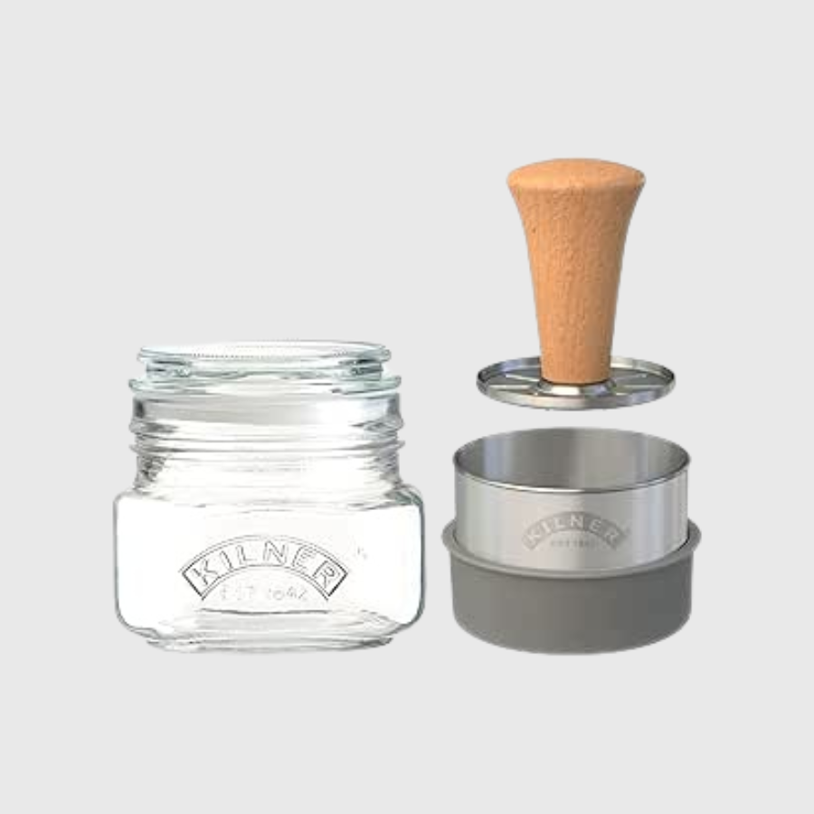 - L'ensemble comprend: 1 pot carré en verre Kilner® de 17 oz liq. Américain avec couvercle à pousser, 1 panier à écraser en acier inoxydable 18,10 po, 1 manchon en silicone, 1 outil à écraser en acier inoxydable avec poignée en bois de hêtre, 1 livret d'instructions et de recettes