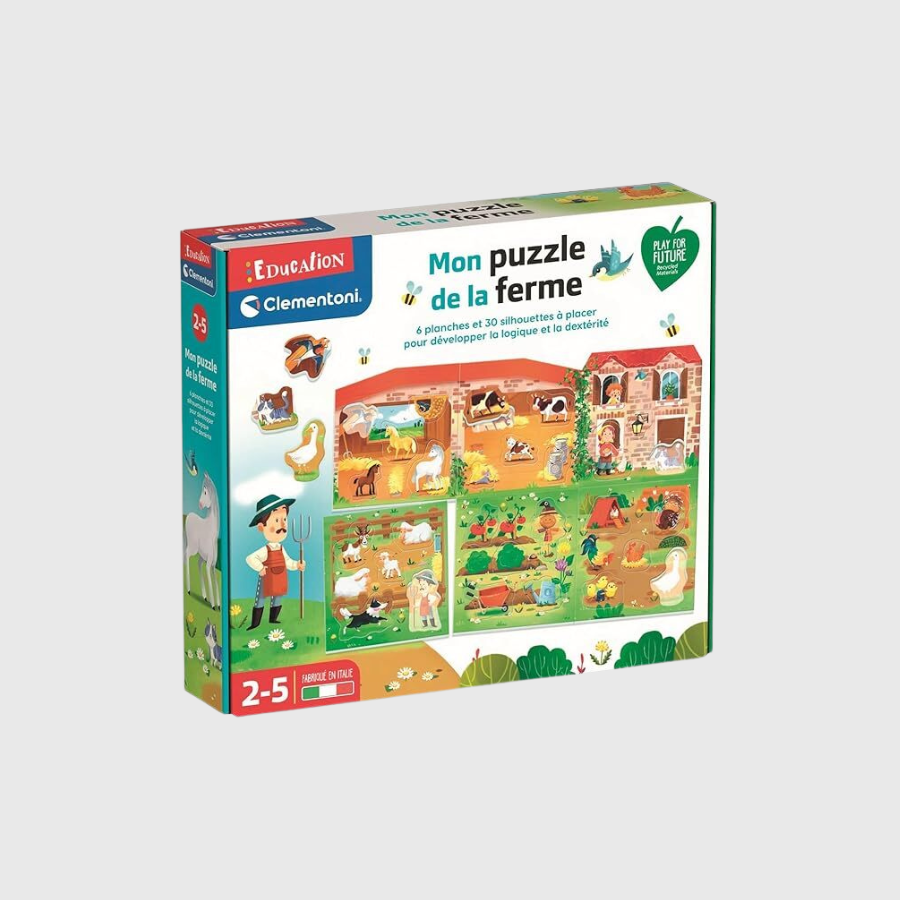 EDUCATIONAL TOY -- A game to discover every corner of the farm. 6 boards and 30 silhouettes to place to develop logic and dexterity.