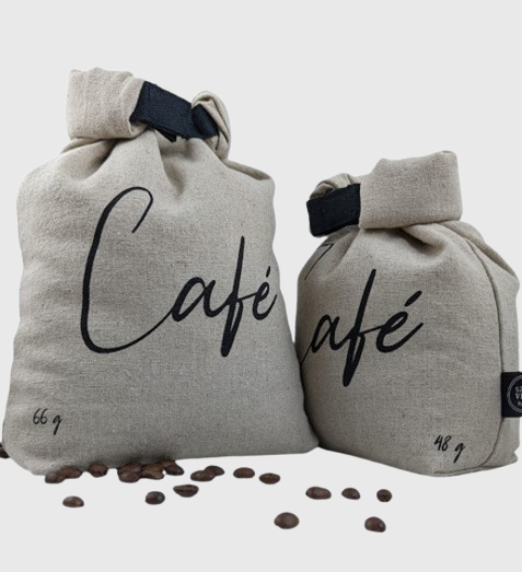 Deux formats de sacs à café en lin, idéal pour le café en vrac et moulu. Chaque sac à café est identifié avec son poids afin de permettre de payer la bonne quantité de café que vous achetez lorsque vous passez à la caisse. Le poids du grand sac à café est de 66 g et le plus petit sac est de 48 g.