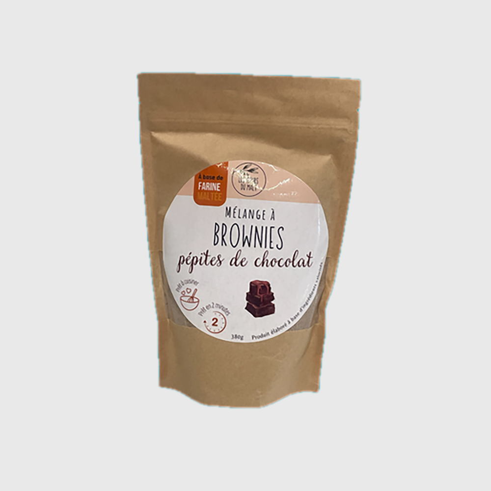 Mélange à Brownies malté aux Bleuets, fait à base de farine maltée brune, riche en fibres et en protéines et de chocolat valorisé.