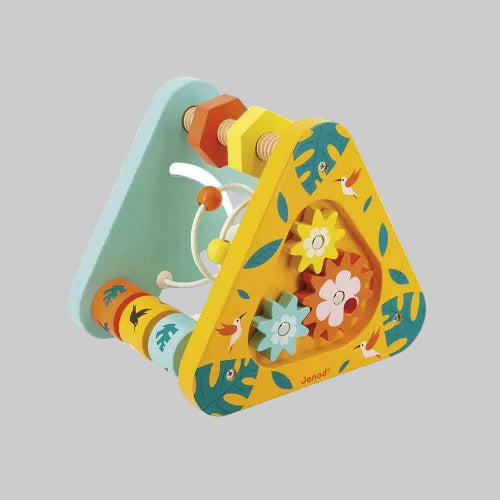 Triangle multi-activités et multi-vitaminé ! Ce jouet d'éveil promet de nombreuses découvertes à bébé. Avec 7 activités : Labyrinthe, miroir, engrenages à tourner, écrous à visser, boulier, bâton de pluie et cylindres à aligner, ce jouet en bois est idéal pour les enfants dès 12 mois. Compacte, ce jouet complet est facile à transporter partout et à manipuler par l'enfant. Les petits dès 1 an vont pouvoir développer leur motricité fine, leur coordination et se familiariser avec les couleurs et les formes ! Avec une multitude d'activités sur chaque face, bébé n'a pas fini de découvrir de nouvelles choses ! Ce jouet d'éveil en bois est peint à l'eau, il est en bois issu de forêts gérées durablement, certifiées FSC®.